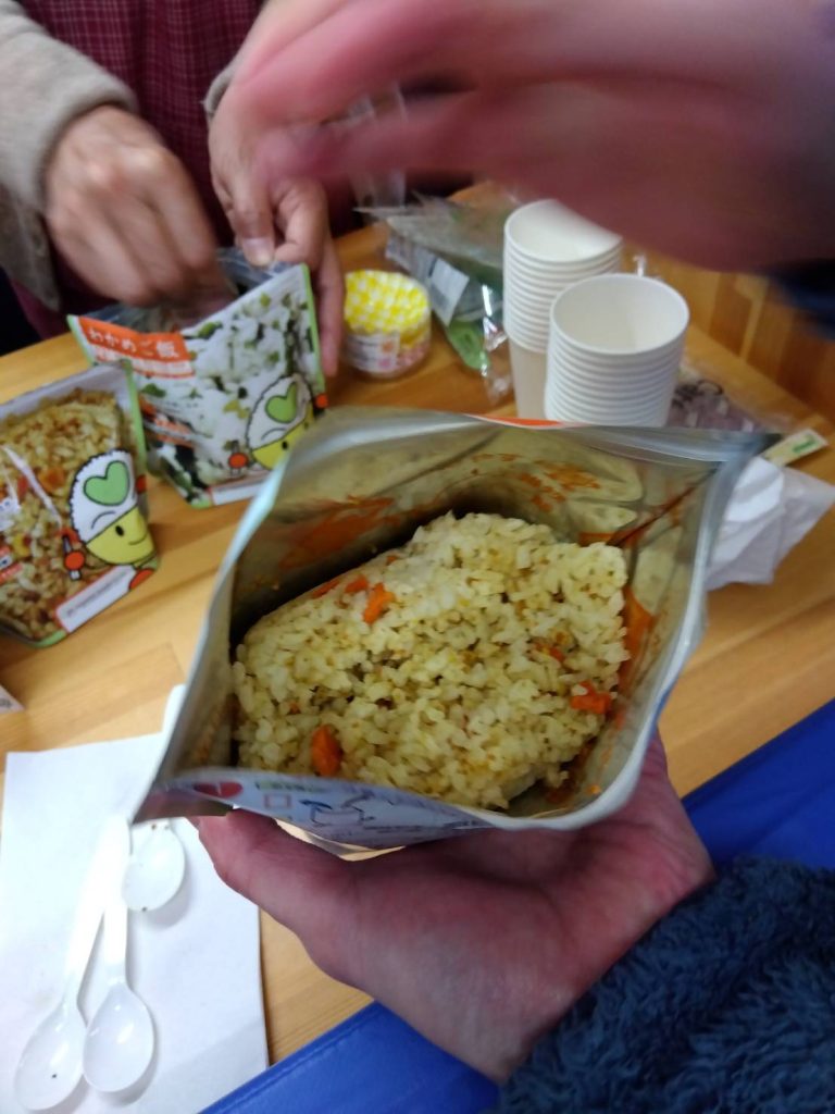 電気自動車より給電した電気とポータブル蓄電池を使い、ファンヒーターで部屋を暖めたり、電気ポットでお湯を沸かして非常食も作り、みんなで試食をしました。