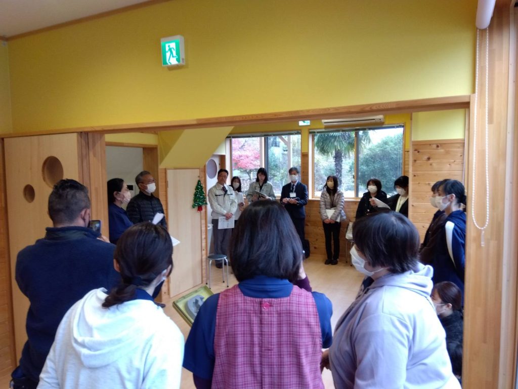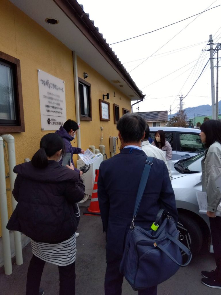 事業所職員の他、上田市障がい者支援課、危機管理課、基幹相談支援センター、V2H(電気自動車から建物内に電気を取り組む設備)を施工したアクアスミス社の担当者も参加し、避難訓練を行いました。