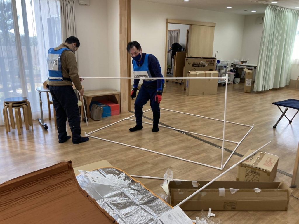 電気自動車より給電した電気とポータブル蓄電池を使い、ファンヒーターで部屋を暖めたり、電気ポットでお湯を沸かして非常食も作り、みんなで試食をしました。